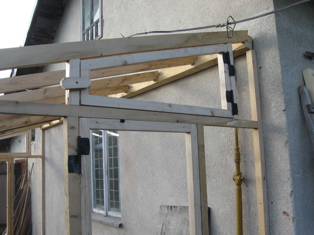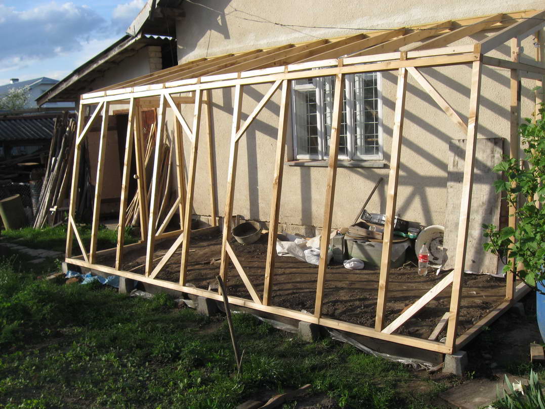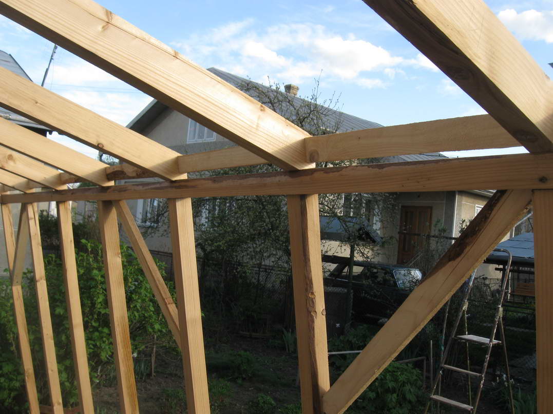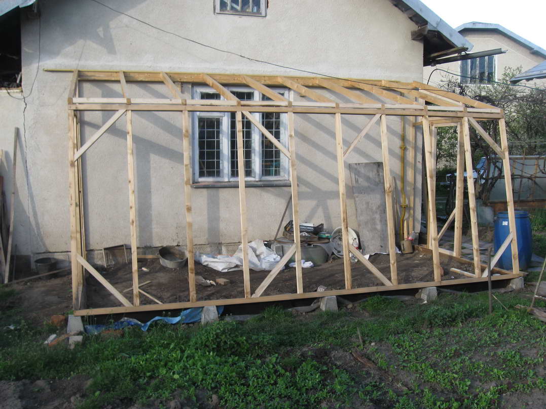 Протягом двох днів усі дерев'яні елементи були оброблені біозахистом двічі та встигли висохнути. На поверхні утворилися якісь світло-зелені висоли. Напевне дерево не повністю впитало солі, які були в розчині. Судячи по кольору, це може бути залізний купорос. Оскільки основні елементи теплиці уже виготовлені і прикручені до стіни, замикаємо конструкцію за допомогою стропил. Вони виготовлені із брусків 5х7см. Довжину визначаємо на місці, заодно підбираючи кут нахилу фронтальної рами, щоб вона була перпендикулярна до напряму на сонце у полудень. Так, як стропила розташовані похило, то підрізуємо їх так, щоб вони дотикалися із поверхнями, на яких лежать, площинами. Закріплюємо їх цвяхами довжиною 100мм, попередньо просвердливши в стропилах отвори. Таким чином зменшуємо ймовірність руйнування конструкції від ударів під час забивання цвяхів. Також вирішив додатково посилити кріплення до стіни рейки, на яку опираються стропила. Для цього по обидві сторони вікна підпер рейку двома брусками, котрі прикріпив до стіни дюбелями довжиною 100мм. Це додатково збільшить максимальне вертикальне навантаження. За допомогою двох вертикальних та горизонтального бруска формуємо на бокових сторонах місце для дверей та вікон для вентилювання. Горизонтальний брусок також надає додаткової жорсткості конструкції, фіксуючи фронтальну раму від обертання відносно нижньої основи. Результат роботи чергового дня - каркас теплиці, у якому ще необхідно влаштувати двері, якісь елементи для вентилювання та додатково посилити жорсткість конструкції.