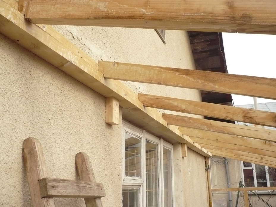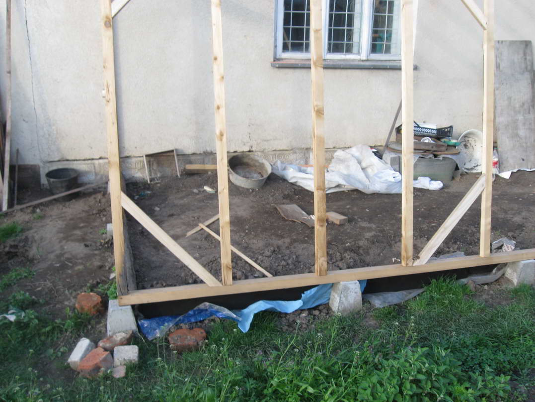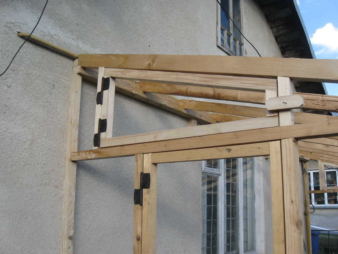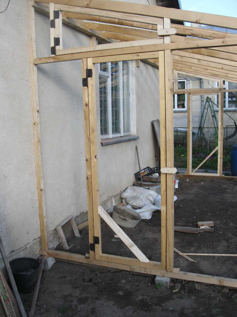Протягом двох днів усі дерев'яні елементи були оброблені біозахистом двічі та встигли висохнути. На поверхні утворилися якісь світло-зелені висоли. Напевне дерево не повністю впитало солі, які були в розчині. Судячи по кольору, це може бути залізний купорос. Оскільки основні елементи теплиці уже виготовлені і прикручені до стіни, замикаємо конструкцію за допомогою стропил. Вони виготовлені із брусків 5х7см. Довжину визначаємо на місці, заодно підбираючи кут нахилу фронтальної рами, щоб вона була перпендикулярна до напряму на сонце у полудень. Так, як стропила розташовані похило, то підрізуємо їх так, щоб вони дотикалися із поверхнями, на яких лежать, площинами. Закріплюємо їх цвяхами довжиною 100мм, попередньо просвердливши в стропилах отвори. Таким чином зменшуємо ймовірність руйнування конструкції від ударів під час забивання цвяхів. Також вирішив додатково посилити кріплення до стіни рейки, на яку опираються стропила. Для цього по обидві сторони вікна підпер рейку двома брусками, котрі прикріпив до стіни дюбелями довжиною 100мм. Це додатково збільшить максимальне вертикальне навантаження. За допомогою двох вертикальних та горизонтального бруска формуємо на бокових сторонах місце для дверей та вікон для вентилювання. Горизонтальний брусок також надає додаткової жорсткості конструкції, фіксуючи фронтальну раму від обертання відносно нижньої основи. Результат роботи чергового дня - каркас теплиці, у якому ще необхідно влаштувати двері, якісь елементи для вентилювання та додатково посилити жорсткість конструкції.