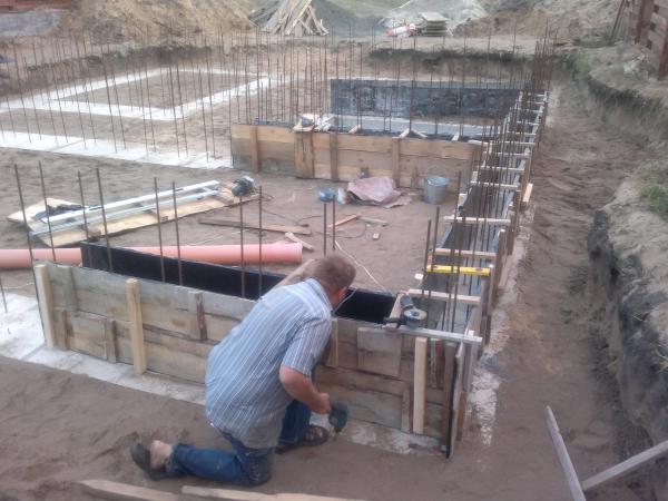 Начали выставлять опалубку под стены фундамента.